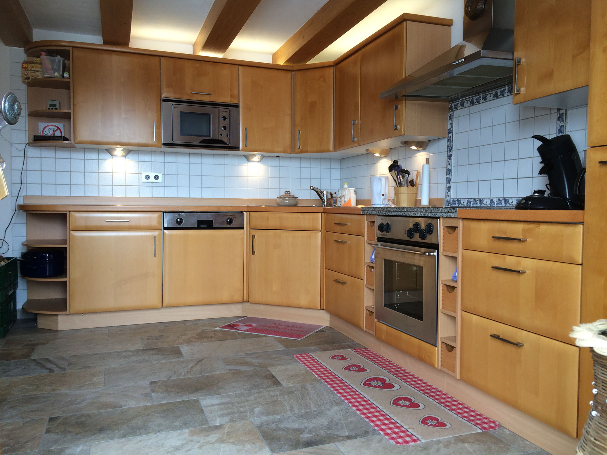 Küche | Geräumige Einbauküche mit Geschirrspüler, Herd, Backofen, Kühl- / Gefrierschkrank und Mikrowelle. Ausstattung: Geschirr, Knetmaschine, Backzubehör, Toaster, Kaffeemaschine und Wasserkocher.